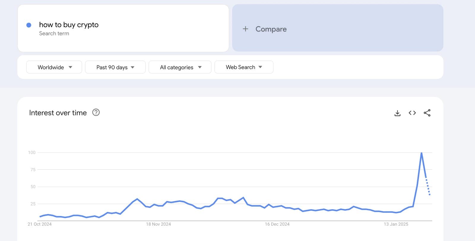 In addition, searches for ‘how to buy crypto’ skyrocketed by 447% in the months leading up to the inauguration, with $TRUMP, $MELANIA and $DOGE making significant waves within the crypto landscape.
