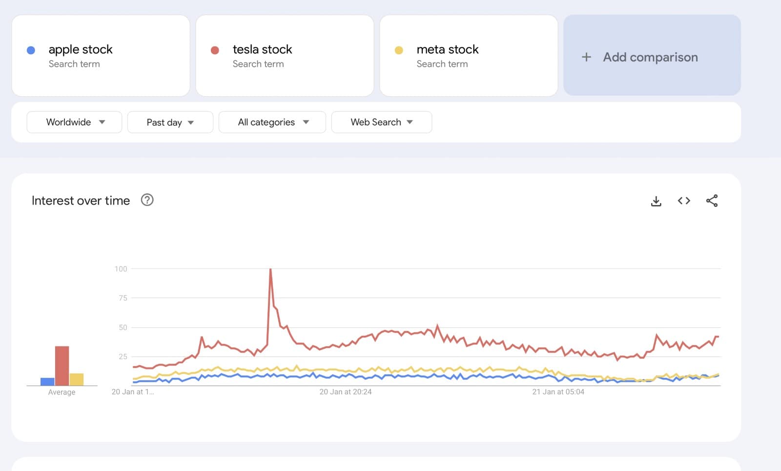 Analysis of worldwide Google search data reveals that online searches for “Tesla stock” exploded 278% worldwide on the 20 January, within an hour of Trump’s inauguration.